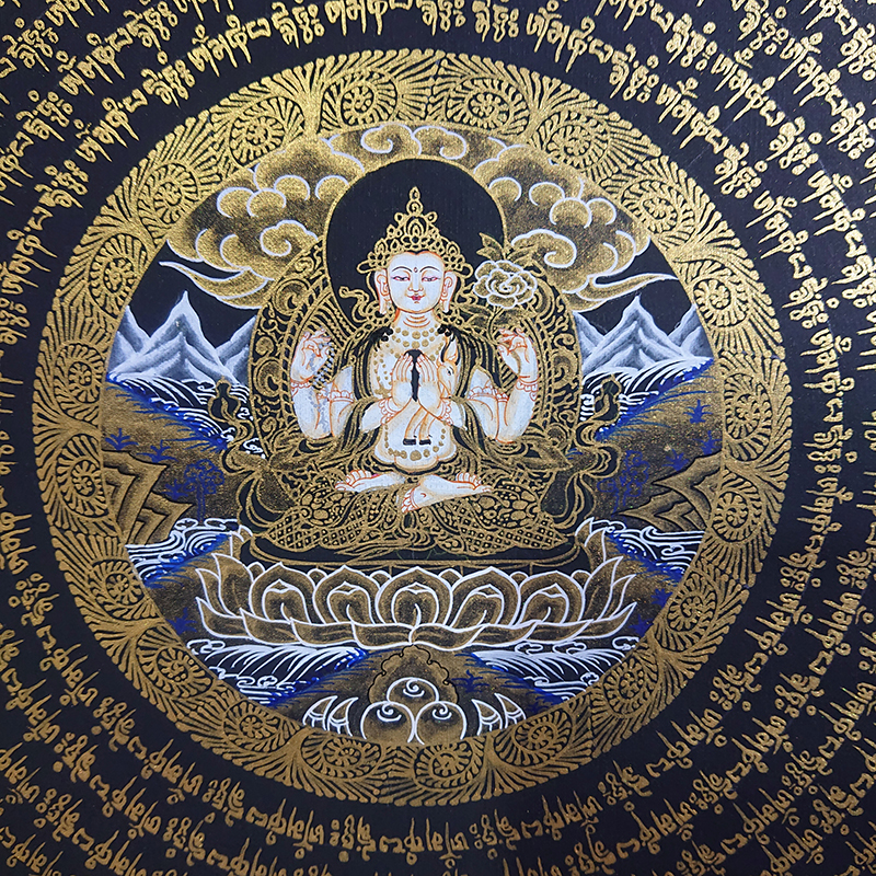 四臂觀音是雪域西藏的守護神,在藏區皆吟通其六字大明咒,嗡嘛呢叭咪件。  四臂觀音與文殊菩薩金剛手菩薩代表大悲,大智,大力,